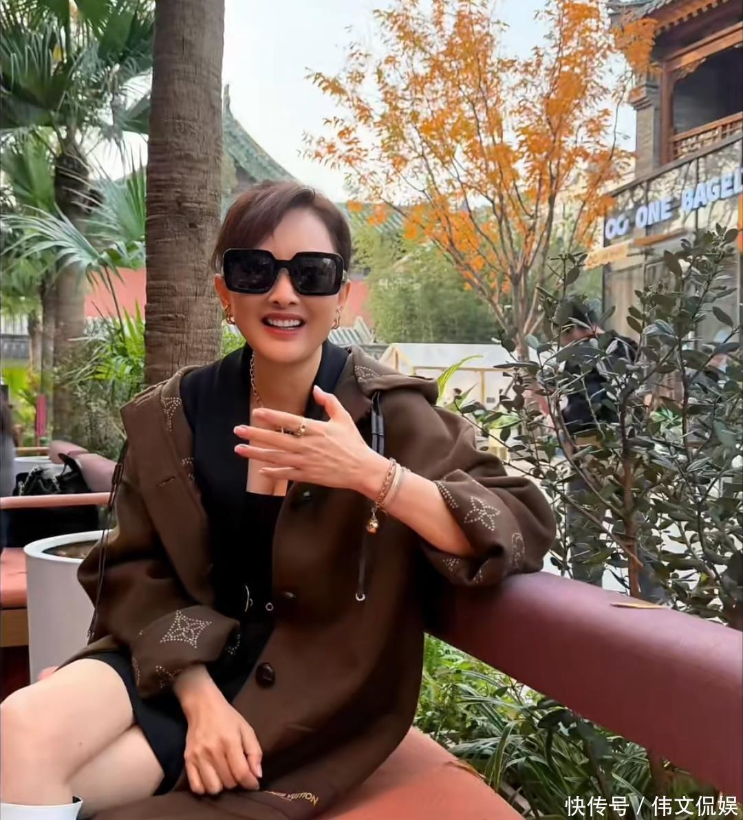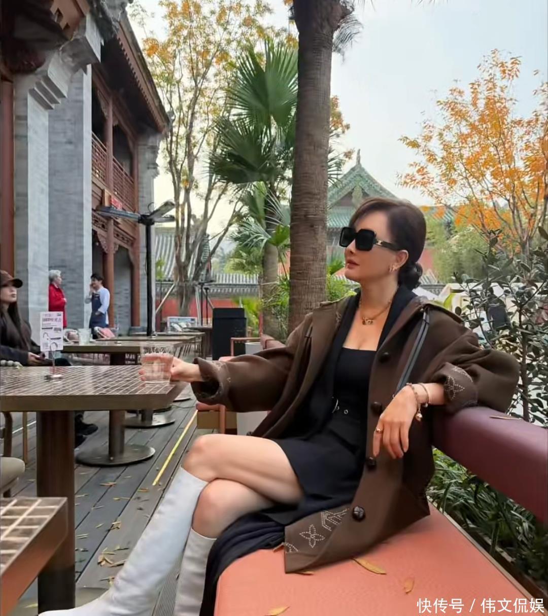 近日,牛莉晒出近照,她和朋友外出喝下午茶,打扮得那叫一个气派漂亮,低丸子头戴着墨镜,倚靠在长椅的样子很有贵妇的气质。